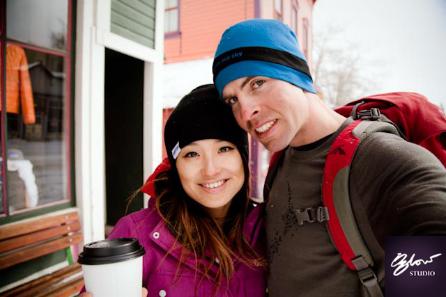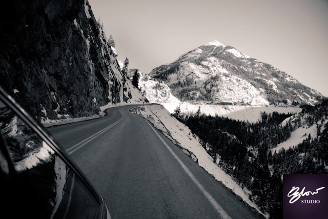 Driving through Red Mountain pass was a highlight, and a life threatening experience. Brett played kiss the cliff edge to make the extreme drive, just that more exciting (to our mothers: we are still alive, it’s ok). We are quite good at self portraits at the most random times. We stopped in the middle of the range, set up our Canon 5D Mark II, (thank you Canon NZ!), on the highway and made use of the snow reflected backlight on the mountain peaks behind us. We later found out that stopping on the Red Mountain pass is a no no, it has the highest avalanche danger in the country. Oops.