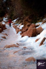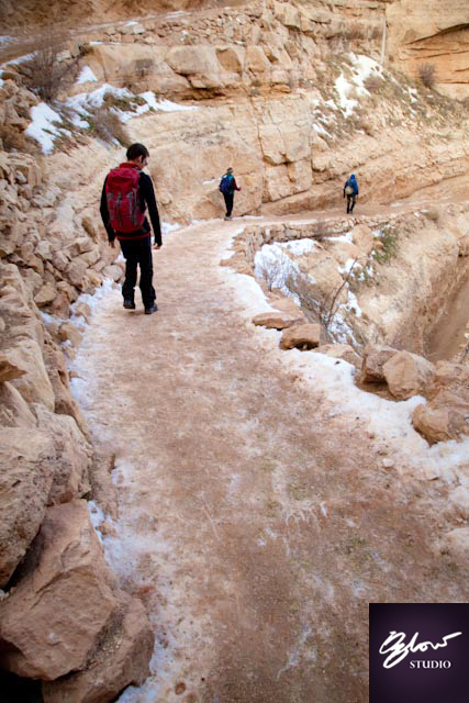 The grueling 16km hike up to the Bright Angel rim of the canyon was enough to bring Susan to tears. Two inches of solid ice covered the last mile of the trail. Most hikers carried crampons or poles to assist them for the journey up; we however, had none. Two steps up, one step down. It was painful, literally.